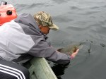 My dream was to land a smallmouth over 20 inches. Two trips devoted to smallmouth. On this trip it happened… It was the fourth day of the trip. End of August and autumn was just around the corner. Calm, sunny skies early morning became cloudy and overcast during the afternoon. We casted all morning and catching a few smaller smallmouth and northerns. We decided to try our luck on the windward side of the lake and trolled the rocky shoreline ranging from 2 feet to 15 feet. I was trolling a 5″ pumpkin pepper colored curly tail grub on 8 lb. test line and Jon was using the same set up only the lure was pearl color. As we passed over a ridge my lure bumped bottom twice and shortly after I got a hit that bent my rod in half… I set the hook and my drag was screeching and line was peeling. A couple of runs underneath the boat had me really concerned as I was thinking this line is going to break and I will never see what this fish is. Moments later I got it close to the boat and my friend Jon netted it… It was a smallmouth! A big smallmouth at 21 inches! My biggest and personal best. I got a couple photos and released her in hope of catching her again in the future.