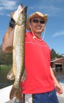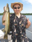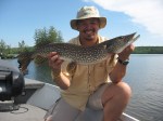 We caught lots of medium size fish. Jon caught his largest largemouth bass at a whopping 18.5 inches and the fish was shaped like a football! Several nice northern pike and smallmouth bass were caught and released each day, and an occasional walleye, rock bass, perch, and largemouth bass. Although we didn’t land a musky, I had two follows during the week at two different locations. Both fish were at least 45 inches long and thick. Jon had a monster pike engulfed his jig and when he set the hook the line just snapped. The bass were in the weedbeds tight up against the shoreline in their spawning phase. The pike were everywhere it seemed like but most of the bigger ones we caught were in between islands or in quiet weedy bays. Fishing was always better in the bays where the wind was blowing into the bay. We both had sore wrists from pulling in so many fish.