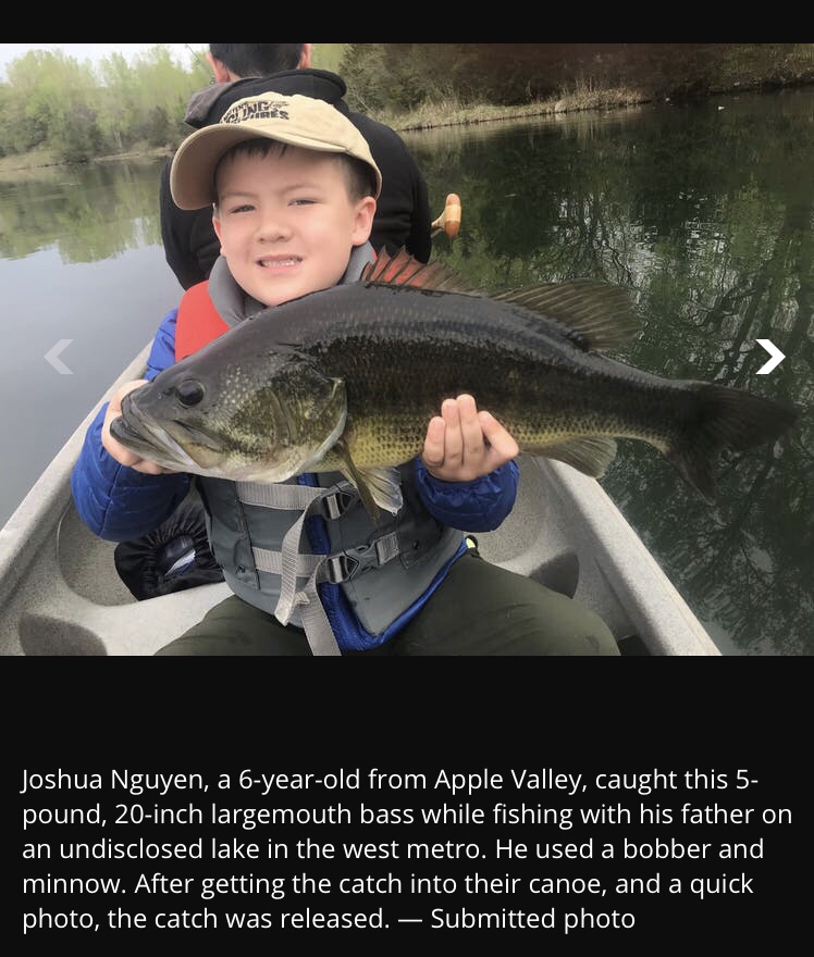 A roller coaster of a week. From his allergic reaction that led to being rushed by ambulance to the ER earlier this week, now gracing the back of today’s Sports section of the Star Tribune with his big bass. He is all smiles this morning!