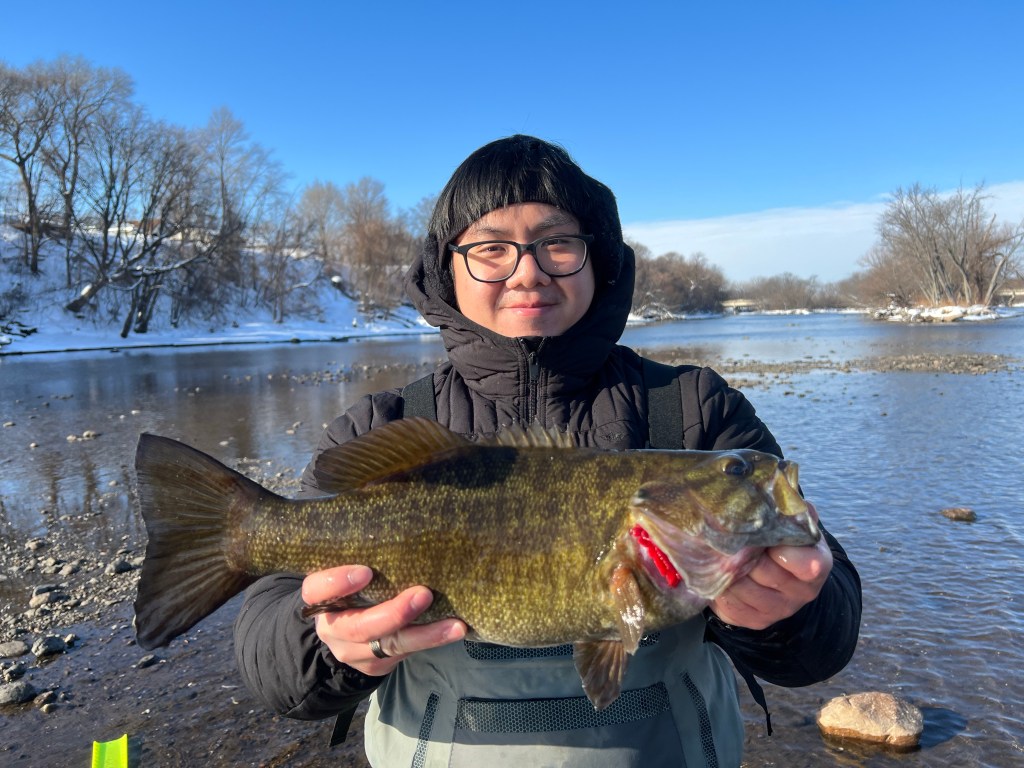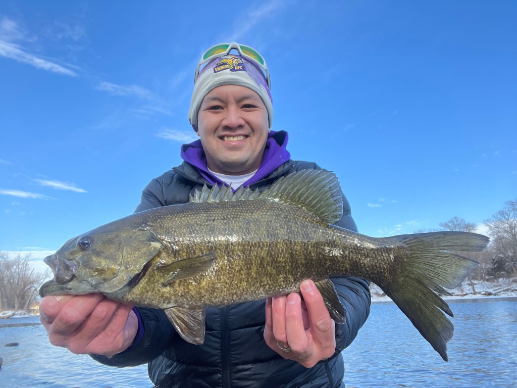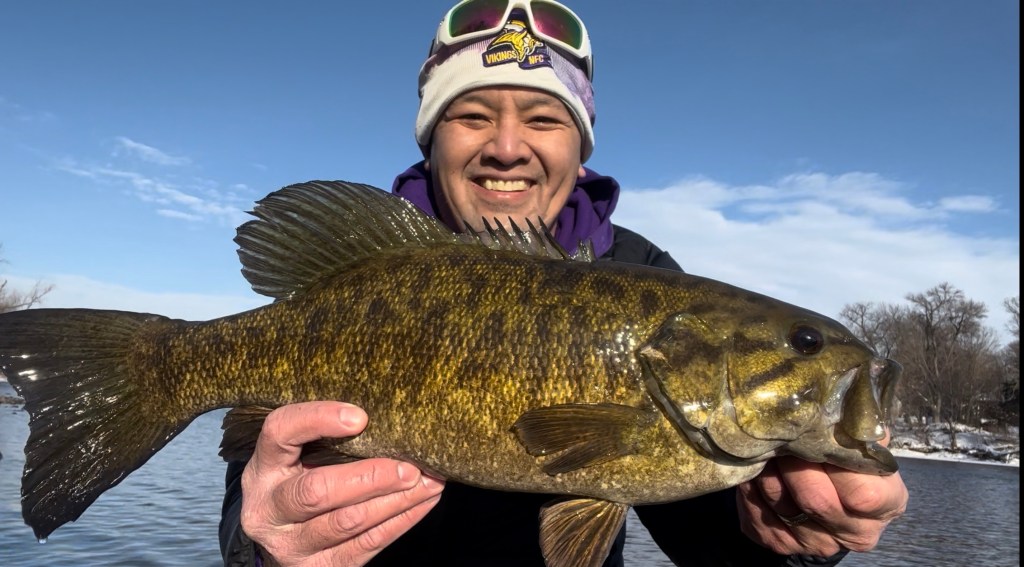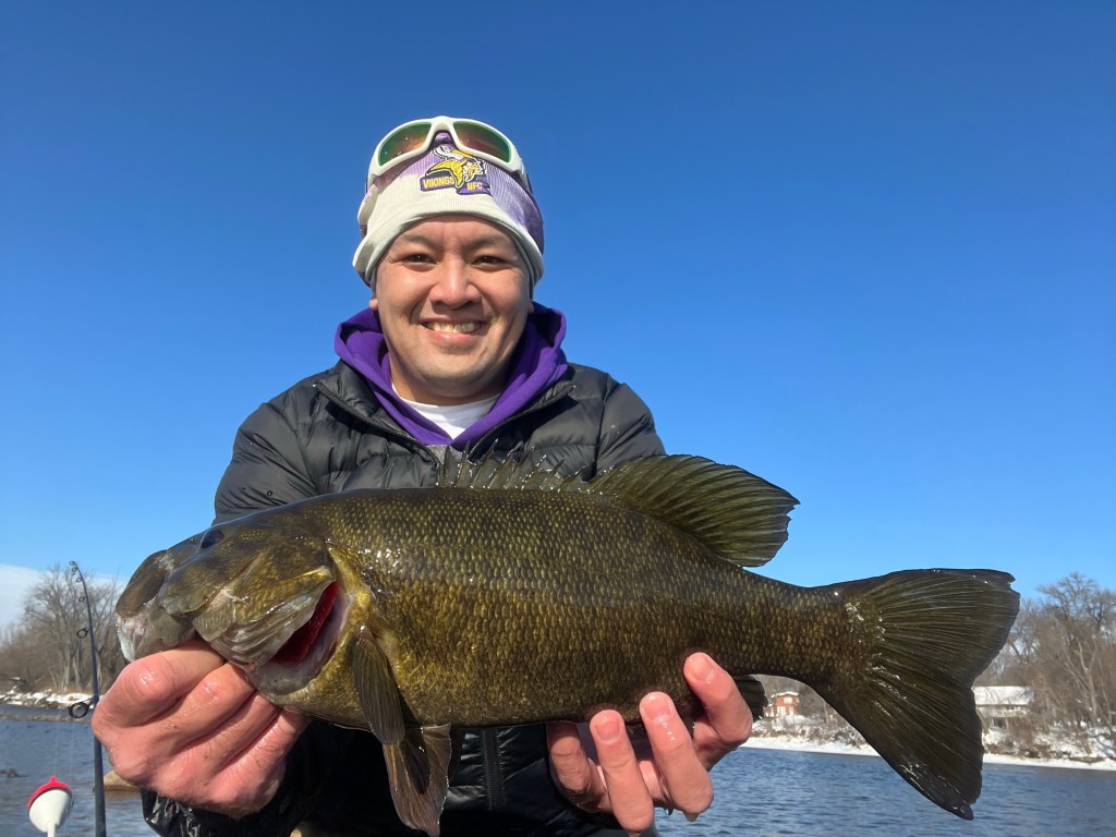 A nice warm-up on Sunday, January 15th got the smallies into a little feeding frenzy! Nonstop action for a good couple hours. A few fish caught on tubes, blade bait, mostly live bait. Biggest of the day was 20″ at 4.2 lbs. as shown in this video. Fun day! Check out the video and photos below.
