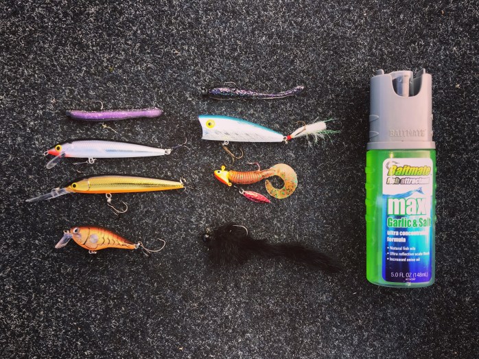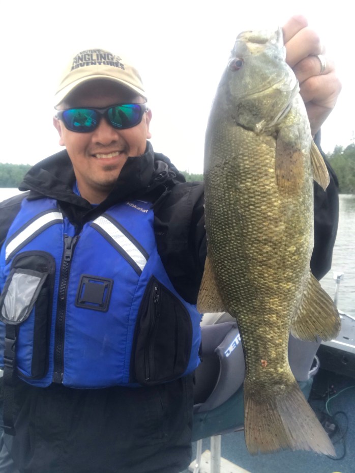 Weather was in the low-50s to mid-70s for most of the week. The smallmouth fishing was good. Fish were in post-spawn. They were shallow around rocky points and big boulders early morning and dropped to 8-10 feet of water by mid-morning. The biggest of the trip was 18.5″ smallie on a silver Husky Jerk. The mayfly hatch had just started and fish were gorging themselves with it. Most mornings started off pretty slow but the action picked up later in the day, especially when we had a little bit of wind. The black 1/8 oz. hair jig worked slow was great as well as the 1/4 oz. underspin rigged with a 3″ pumpkin pepper curly tail grub.
